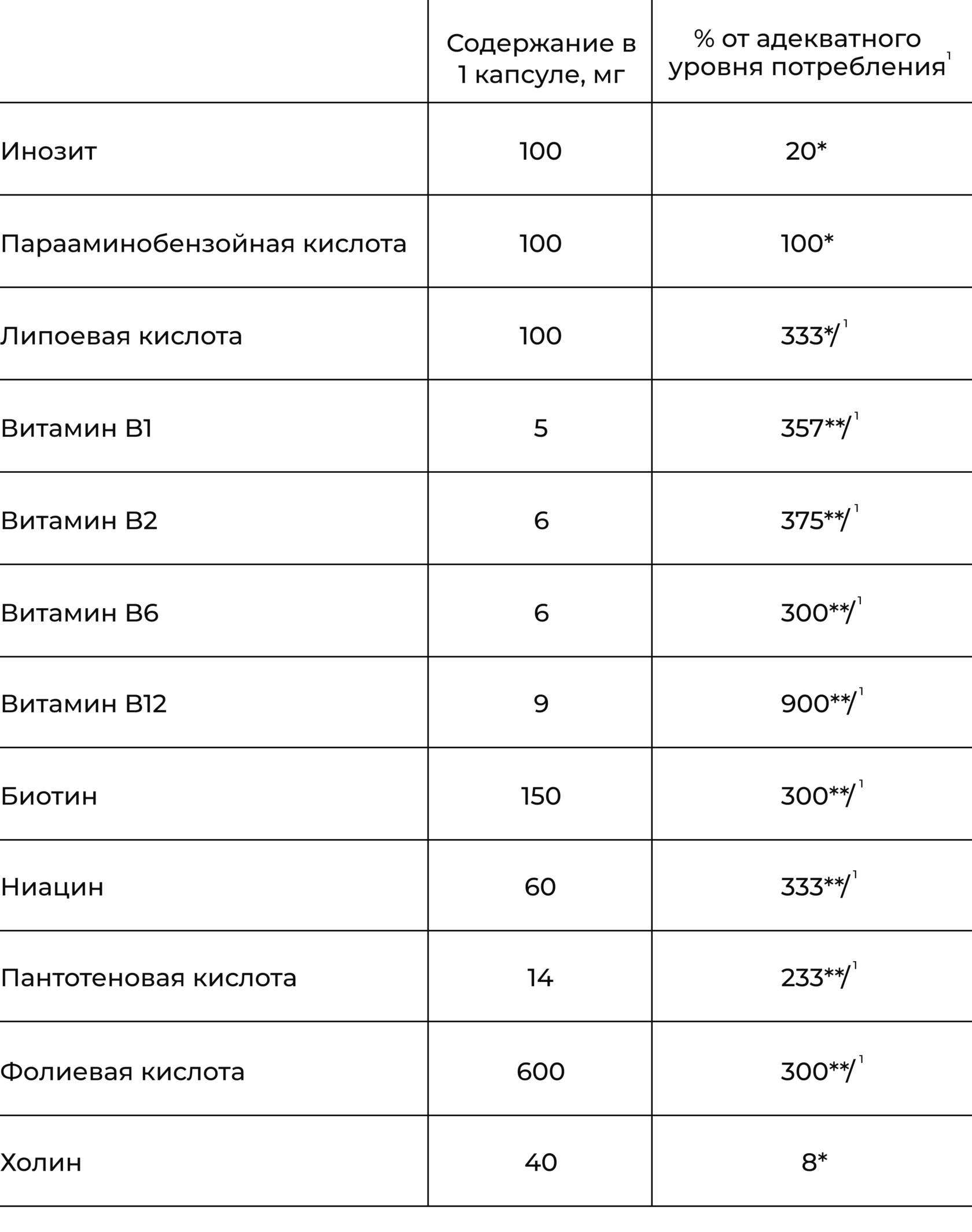 Биотин, ниацин, пантотеновая кислота и фолат входят в формулу в дозировках, ориентированных на ежедневный приём, и задействованы в процессах, связанных с состоянием кожи, волос и ногтей, а также с метаболическим комфортом на фоне современного ритма жизни. Все компоненты собраны в одной капсуле, что делает В-комплекс Active METAFACTOR удобным вариантом для регулярного курсового приёма без необходимости комбинировать несколько отдельных добавок